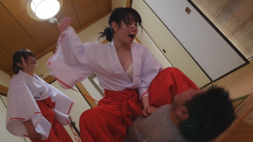 清楚な巫女がドSな本性を剥き出しにして、殴る蹴るの過激な暴行を繰り返す。